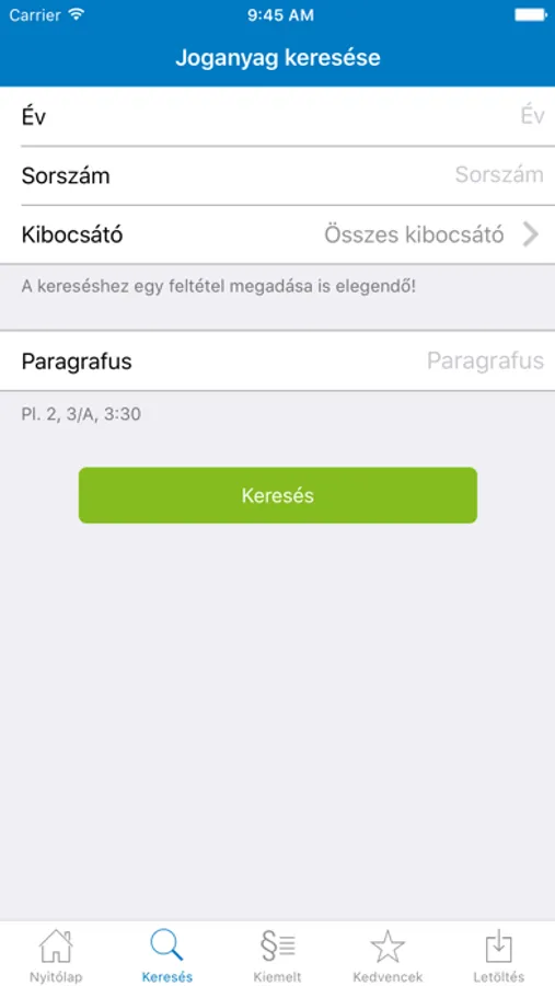 – Kereshet kifejezés megadásával (szabadszavasan). Kereshet a dokumentumok között évszám, sorszám, kibocsátó és paragrafus alapján is.