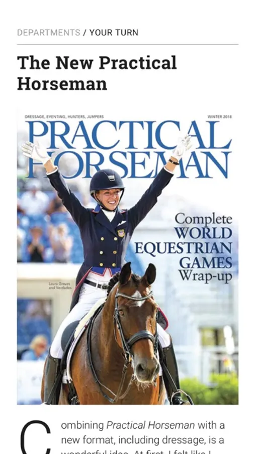 True to its name, Practical Horseman magazine provides hands-on, instructive articles on riding and training, horse care and competition for English riders in hunters, jumpers, equitation, dressage and eventing. Clearly written, skillfully photographed step-by-step articles bring the expertise of top equestrians to the magazine's goal-oriented readers. Profiles and features create a sense of community, from top professionals to dedicated amateurs.