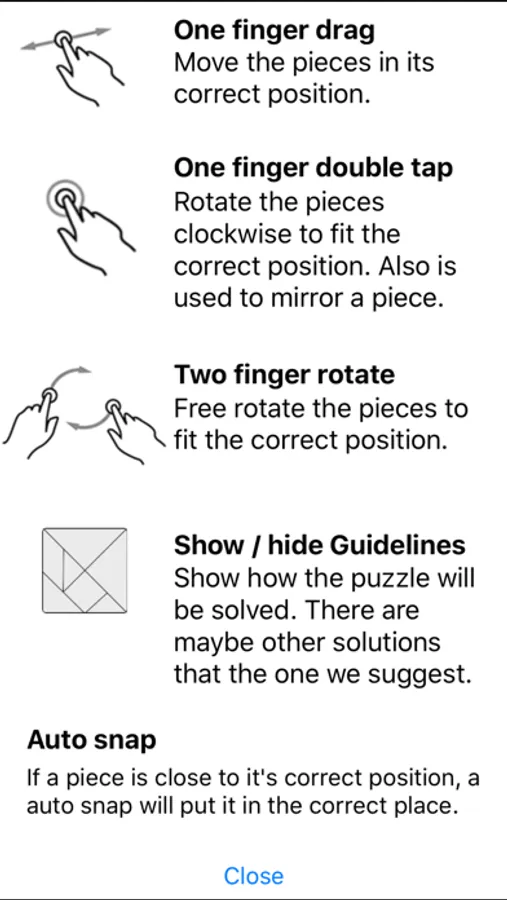 Select a new shape by random or one-by-one, drag the piece out of the lower bar and place it in the correct position and orientation. You can turn the pieces by double-clic or freehand rotation.