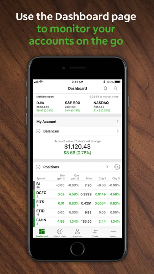 • Use the Dashboard page while on the go to check in on the markets and your accounts