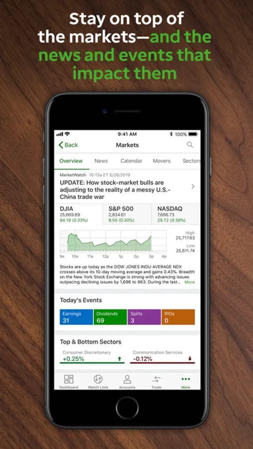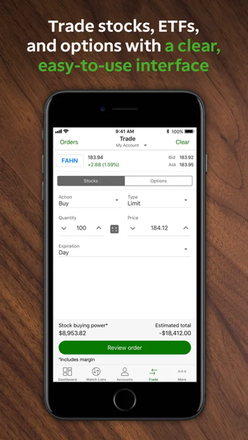 • Track and trade stocks, options (up to two-leg strategies), options chains, and exchange-traded funds (ETFs), and even check your order status when on the go