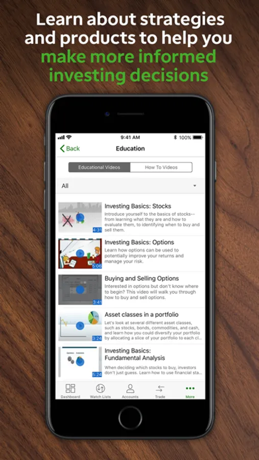 • Take advantage of educational offerings and browse videos on investing strategies, stocks, options, and more—anytime, anywhere