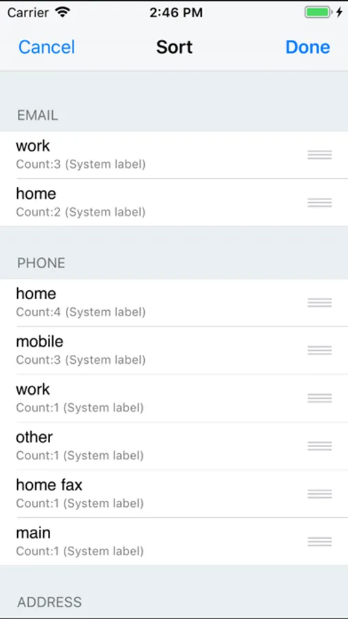 Throw this App you can order the address fields in the particular groups of addresses in specific contacts or in all contacts. You can arrange the order on the address fields in particular contact groups however you like. It also recognizes the address fields in the particular group contacts that were not set and were created by you.