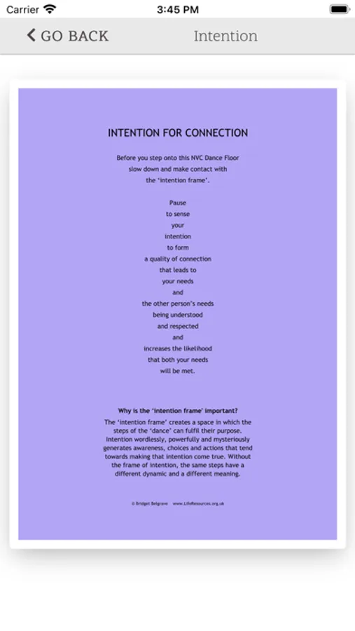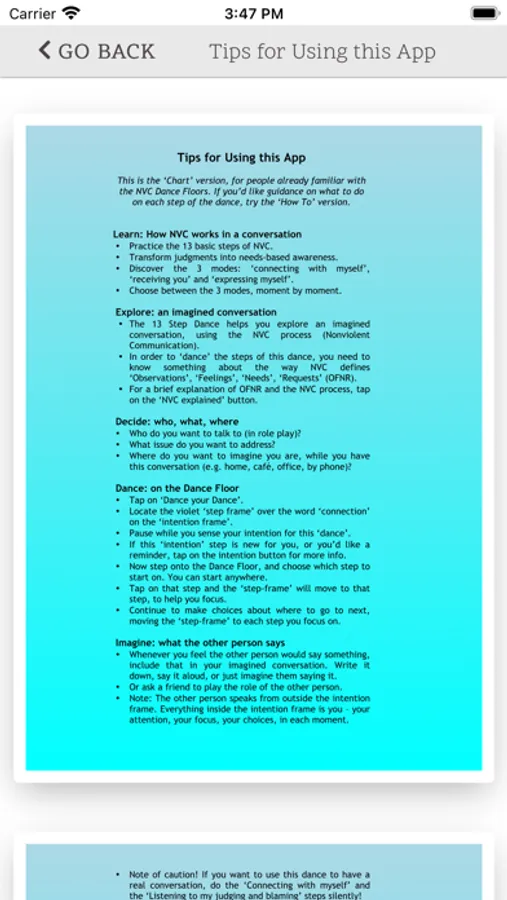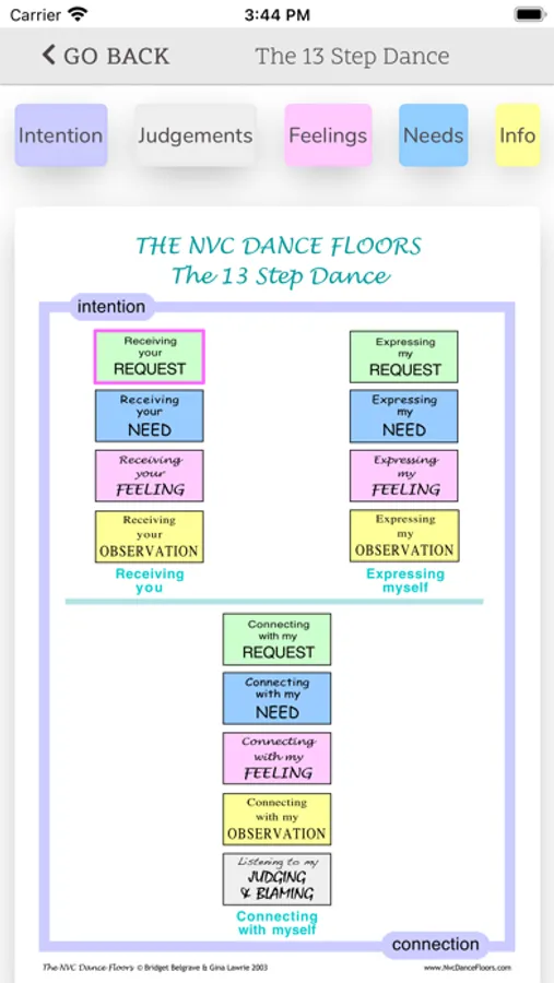 1) This ‘CHART’ App is designed for people who are familiar with the NVC Dance Floors. It is a great way to have the 13 Step Dance chart, a feelings list, a needs list, and an intention reminder, in your pocket, ready to untangle your day’s experiences on the way home, and prepare for tomorrow!