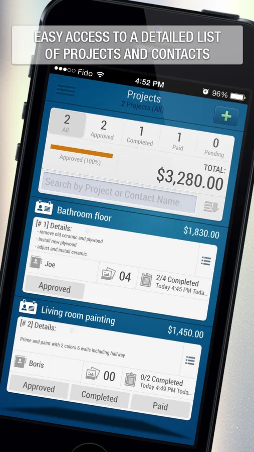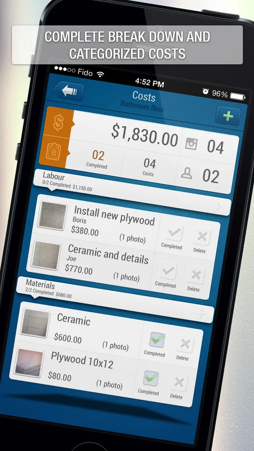 Project Reno will give you the ability to add pictures and categorize the break- down costs of you projects. You will also be able to monitor your projects by changing their statuses from pending to approved, completed and paid.