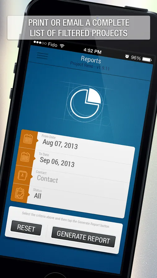 Generate reports by date, contact or status. You can then email or print those generated reports directly from Project Reno.