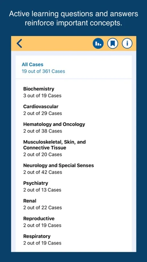 This free application includes 19 FREE biochemistry cases to sample from the 350 cases that are available through an in-app purchase for $44.99.