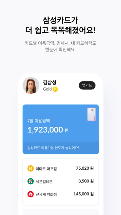삼성카드 앱과 함께 즐거움 가득한 카드 생활을 경험해 보세요.