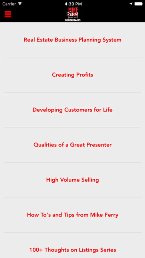 The Mike Ferry Mobile App provides Real Estate Professionals with audio programs that help increase production, profit, and skills. All material is based on Mike Ferry’s 35+ years of experience in Real Estate Coaching and Sales Training.