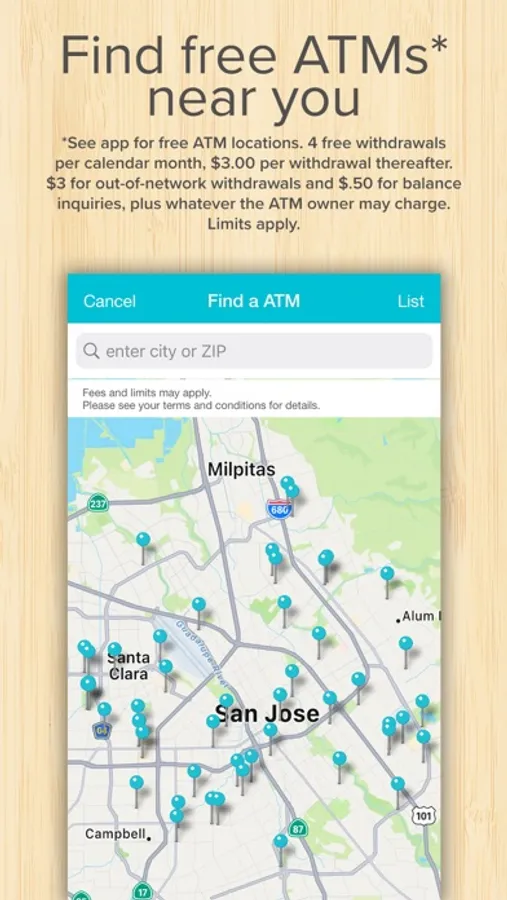 * See app for free ATM locations. 4 free withdrawals per calendar month, $3.00 per withdrawal thereafter. $3 for out-of-network withdrawals and $.50 for balance inquiries, plus any fee the ATM owner may charge. Limits apply.