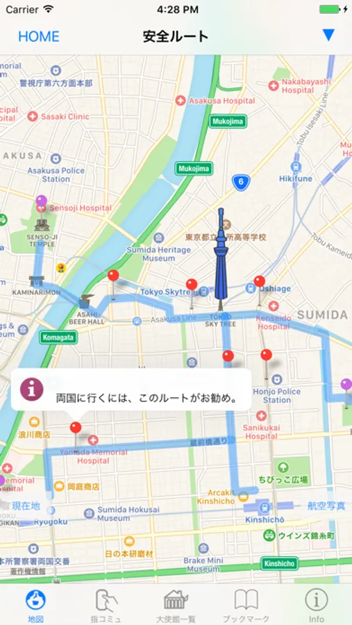 ・浅草寺など、近隣の名所や、主要な駅へ向かう際に安全な道がひと目で分かるようにルートを表示
