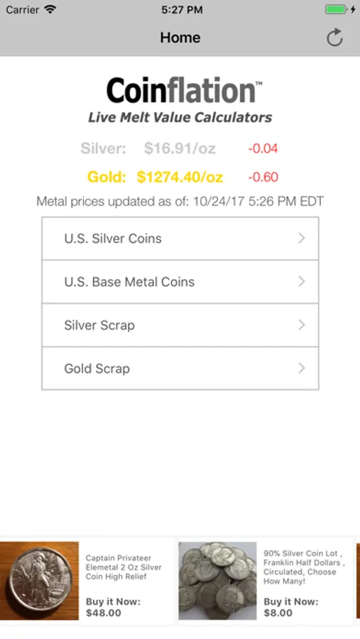 This app incorporates the most popular features of Coinflation.com and features the live 24-hour gold and silver price (updated every minute). The four calculators bundled into one app include U.S. silver coins, base metal coins, gold scrap, and silver scrap.