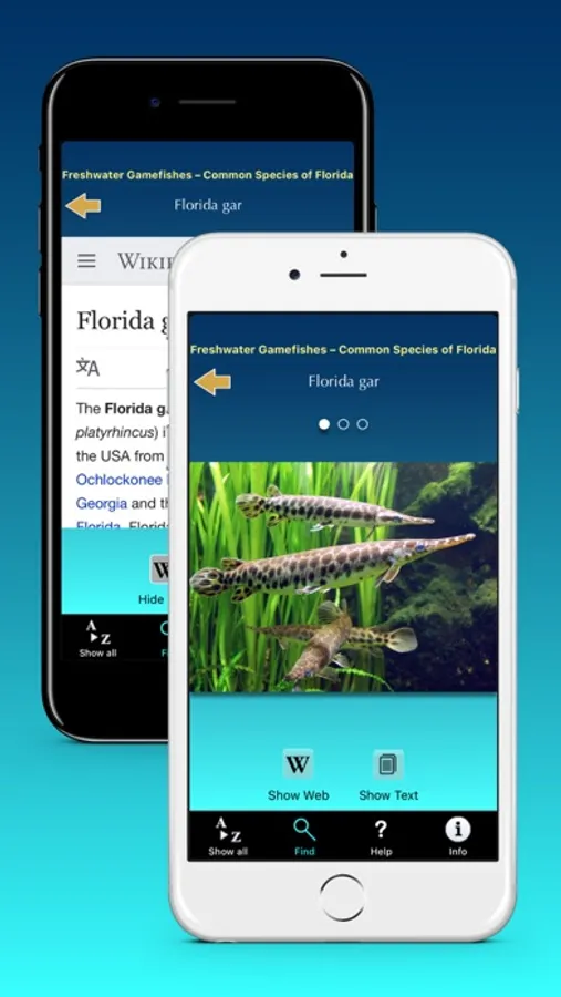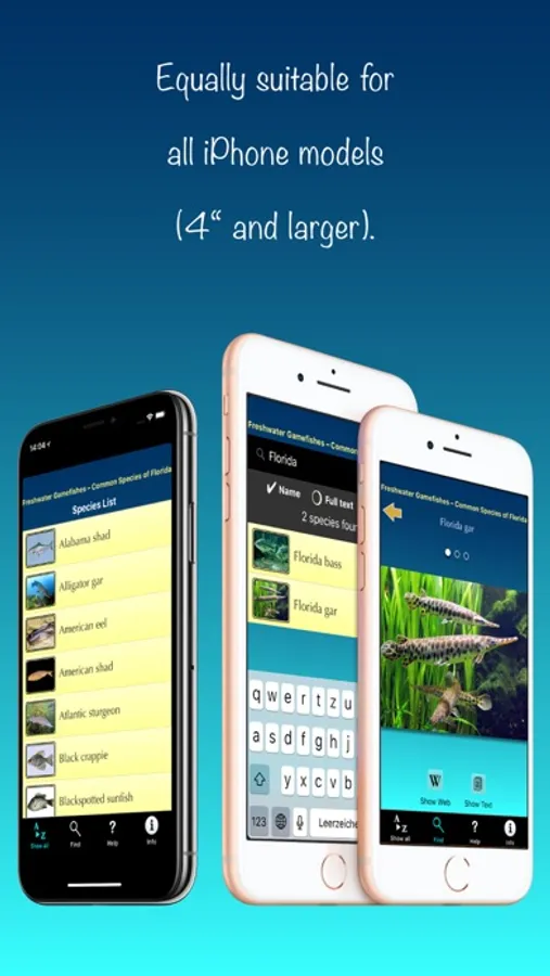 This app shows the 60 most common freshwater fishes found in southern Florida, including the Everglades National Park. For each animal there are two or three high-resolution pictures, a brief description, and a link to view the corresponding Wikipedia pages within the application window. The description includes information about suitable baits for the fishing enthusiasts among the appusers. All descriptive information is in English, the animal names are also shown in scientific (Latin) denomination and in German.
