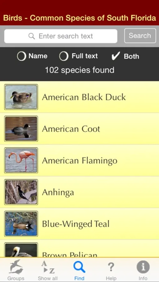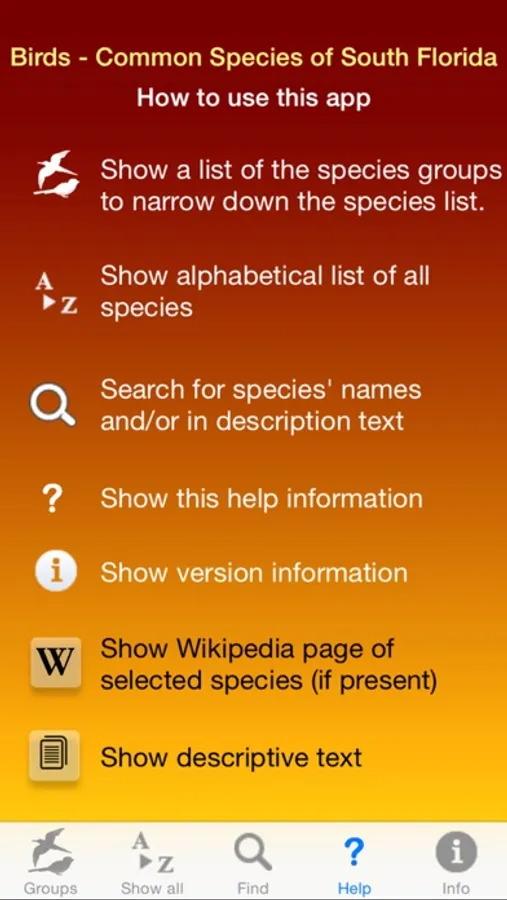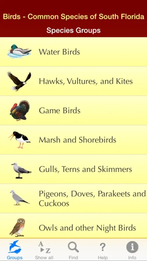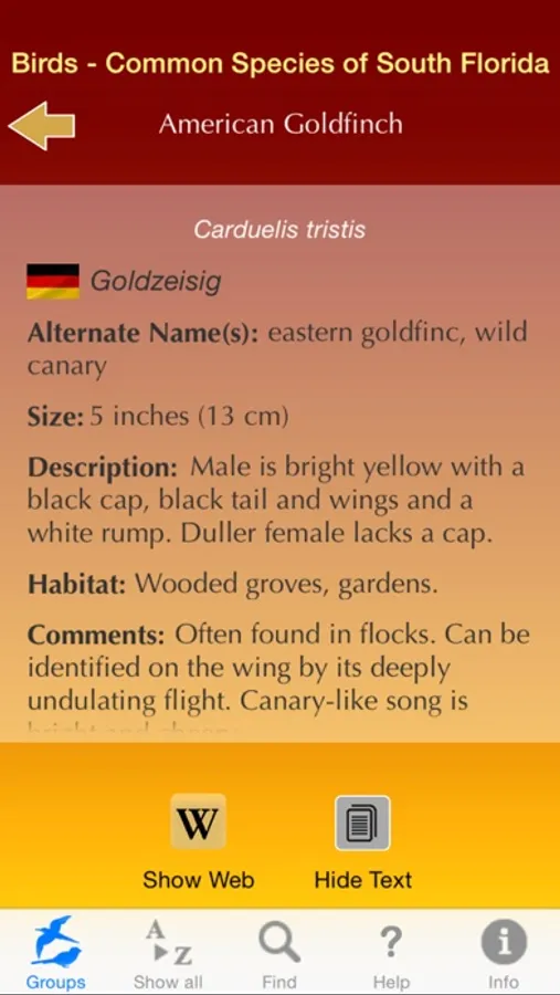This app shows the 104 most common bird species found in southern Florida, including the Everglades National Park. For each bird there are two or three high-resolution pictures, a brief description, and a link to view the corresponding Wikipedia pages within the application window. All descriptive information is in English, the animal names are also shown in scientific (Latin) nomination and in German.