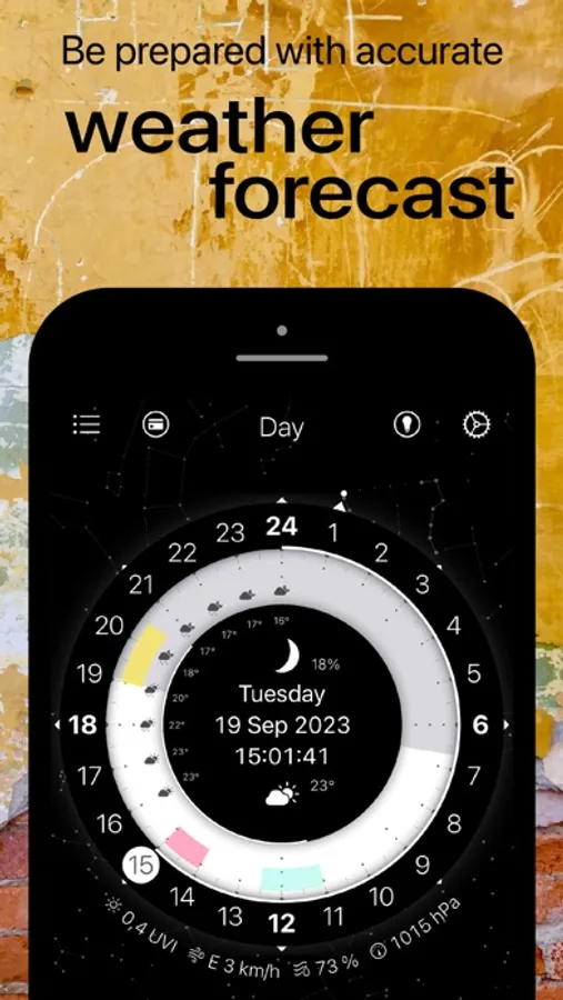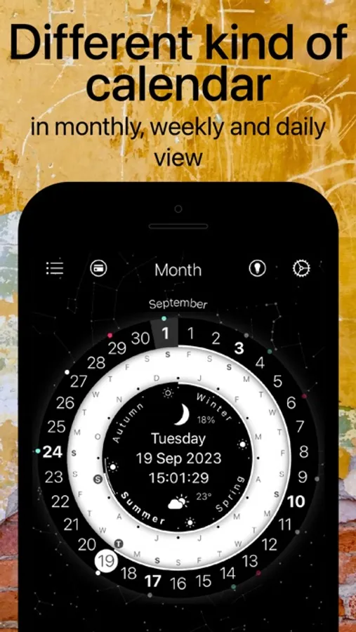 CircleTime has three views (daily, weekly, and monthly) and a menu with editable calendars. The central circle displays the current or selected date, lunar illumination, and weather forecast. You can toggle between moon phases and weather forecast by tapping on the icons. The events list is at the bottom and can be expanded to show all available events. In the monthly view, you can move forward or backward in time by rotating the outer circle or tapping on the desired month. The weekly and daily views display events in the form of arcs and also show daytime/night-time and moon visibility. The daily view additionally displays hourly weather forecast for the next 48 hours.
