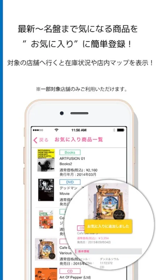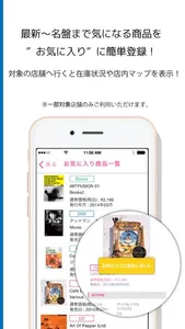 目玉機能②最新の人気曲から懐かしの名盤まで、気になる商品をお気に入り登録できます!対象の店舗内では、気になる商品の在庫状況お知らせ機能が使えます。