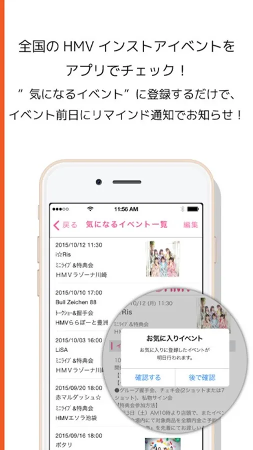 目玉機能③全国のインストアイベントを一斉チェック!気になるイベントに登録すると、前日の夜にリマインド通知でお知らせします。