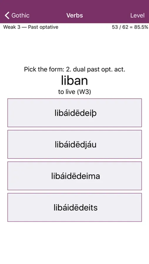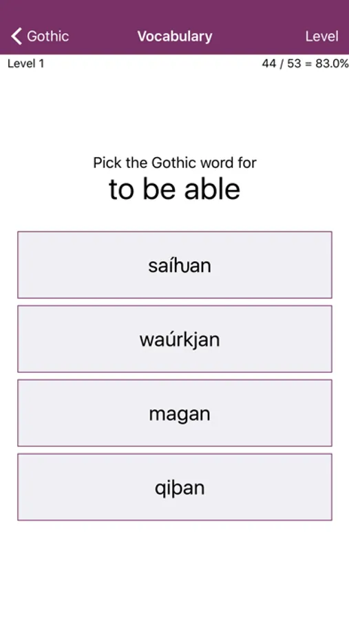 • Vocabulary: 160 levels, each testing the translation of 10 words between English and Gothic. Interspersed among these are cumulative levels reviewing what has been learned earlier (giving a total of 181 levels).