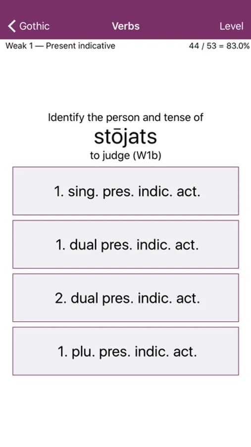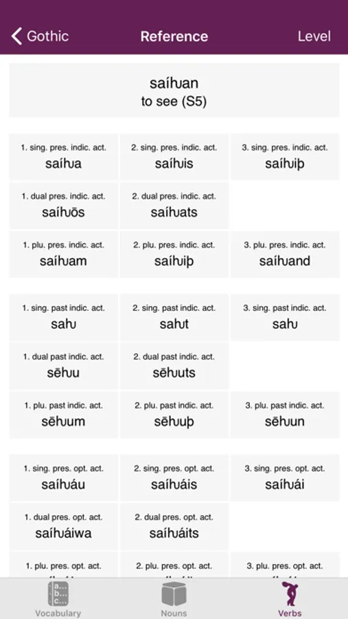 • Verbs: Tests your ability to parse and conjugate all classes of Gothic verbs.