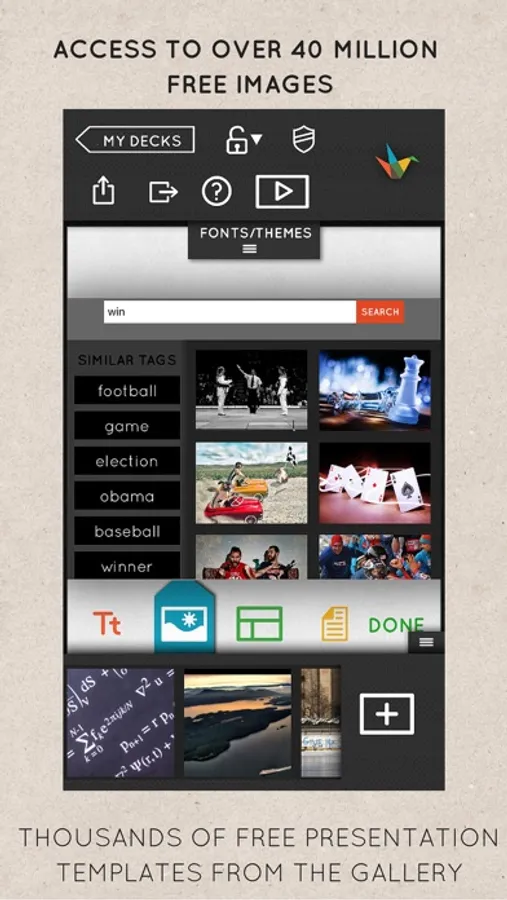 * Powerful image search, with automatic sizing and attribution, puts over 40 million free, high-quality Creative Commons licensed photos at your fingertips or add your own images from your camera roll.