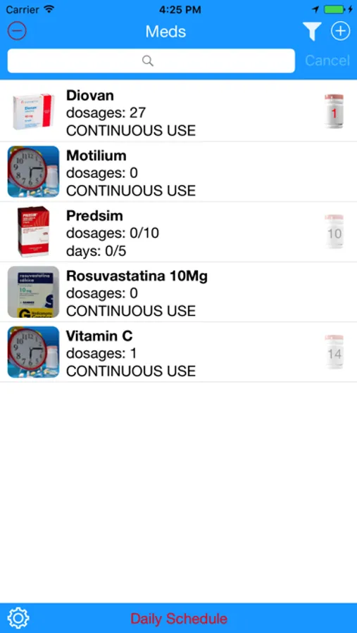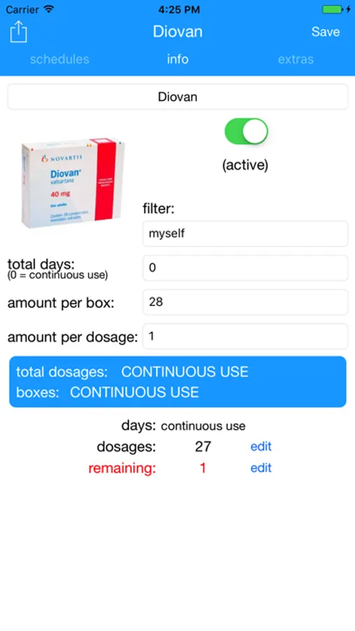 Inserting the number of days, it will make the app reminds you, always, how many days are left to the end of the treatment and how many already were taken.