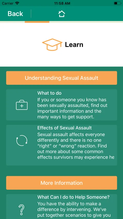 The DoD Safe Helpline app gives members of the military community access to resources and tools to help manage the short- and long-term effects of sexual assault. The app helps you create a plan that is right for you, from exercises that aid in reducing stress to tools to help you transition to civilian life. You can even store your customized plans and exercises so you can refer back to them at any time. The app has four sections:
