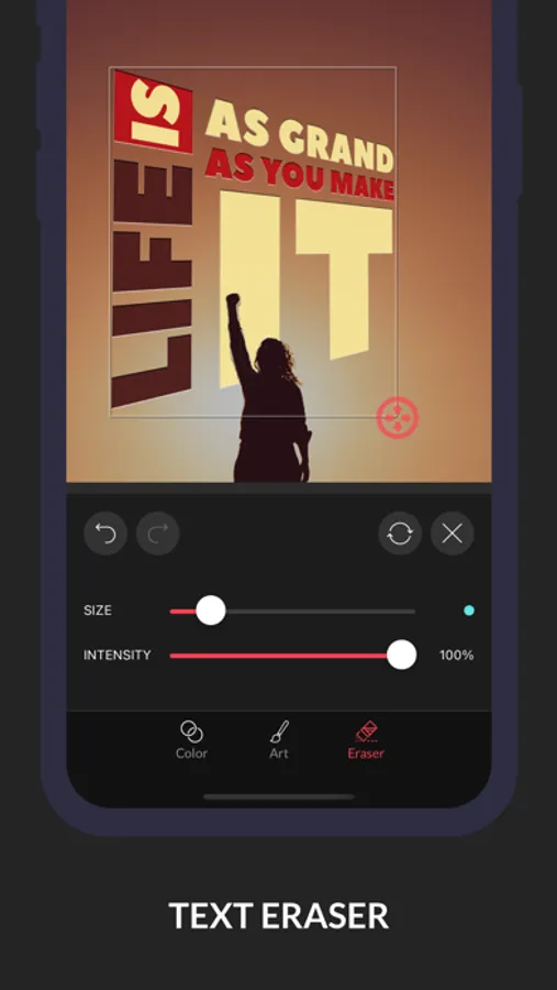 • Eraser tool to gradually delete parts of text - useful for placing the text designs behind other elements in your photo.