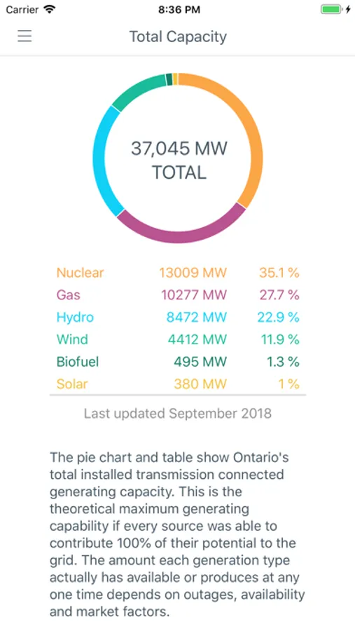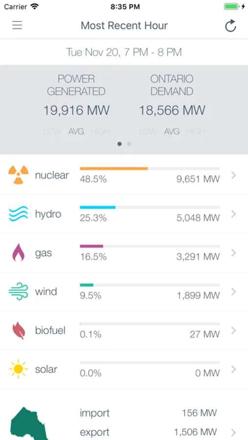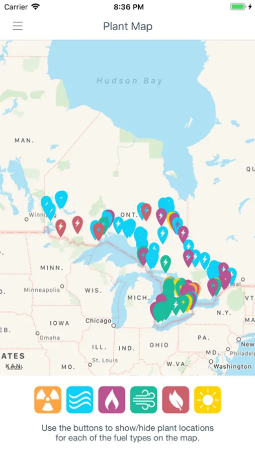 View all power plant locations colour coded by fuel type on an interactive map of Ontario. Filter by fuel type, zoom in/out and tap for details about the specific plant. Track both power and emissions trends for the current day along with Ontario's Time-Of-Use schedule. Interact with the trend graphs to see the impact each fuel type has on the grid.