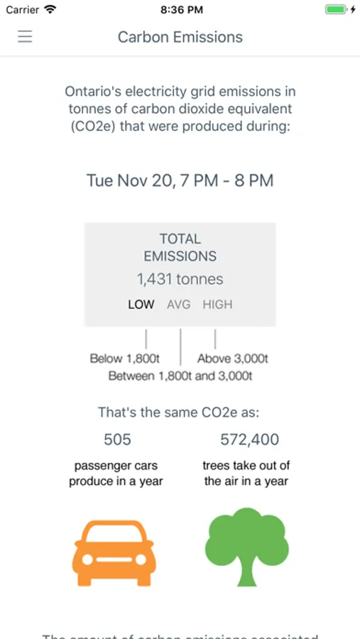 See the total carbon emissions and carbon intensity of Ontario's electricity grid. Drill down into the equivalent emissions in terms of cars and trees to put things in context. Backed by a peer reviewed and published methodology, carbon intensity is a simple indication of how clean (or dirty) the grid is.