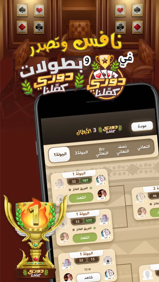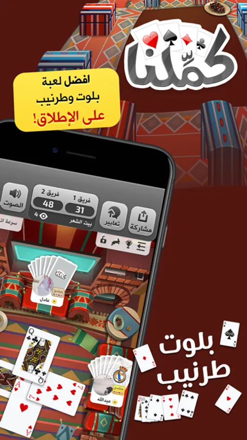 تُتيح لك كملنا فرصة لعب البلوت و طرنيب بكل سهولة مع لاعبين من جميع أنحاء العالم، والدخول في منافسة معهم