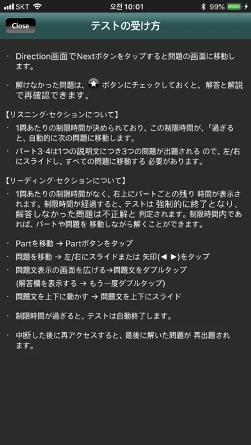 ・模擬テストは100問・1時間のハーフテストで、途中での中止・再開が自由。