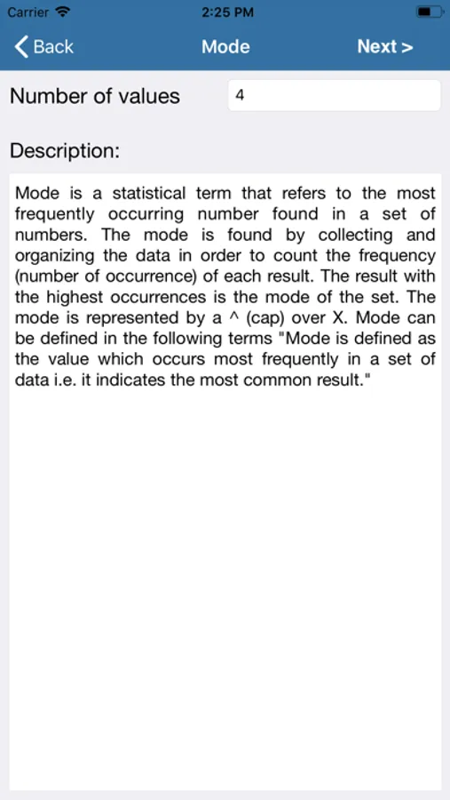 As a statistics guide the calculator provides a comprehensive description of each topic used in this app. The description of a particular topic includes definition(s), formulae, examples and nearly those essentials that you would need to understand that topic.