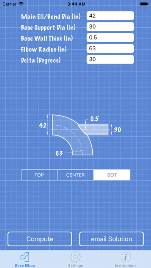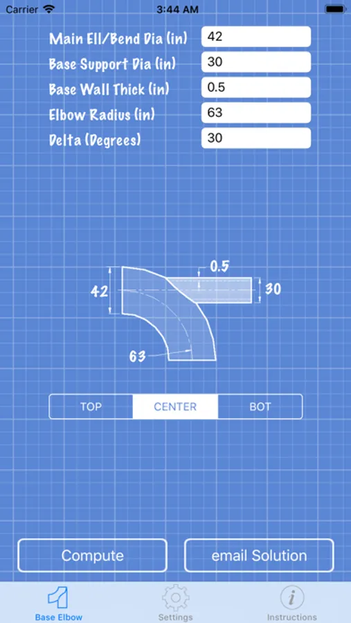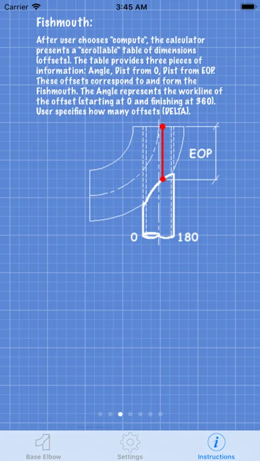 Piping Base Elbow Layout Calculator is a iPhone app that provides the fitter with the points to make an accurate cut (fish mouth, cope, etc) for piping (base pipe cylinder to elbow radius) intersections. This app is intended to be used by fitters, welders, fabricators, or anyone who needs to join a metal cylinder at an elbow.