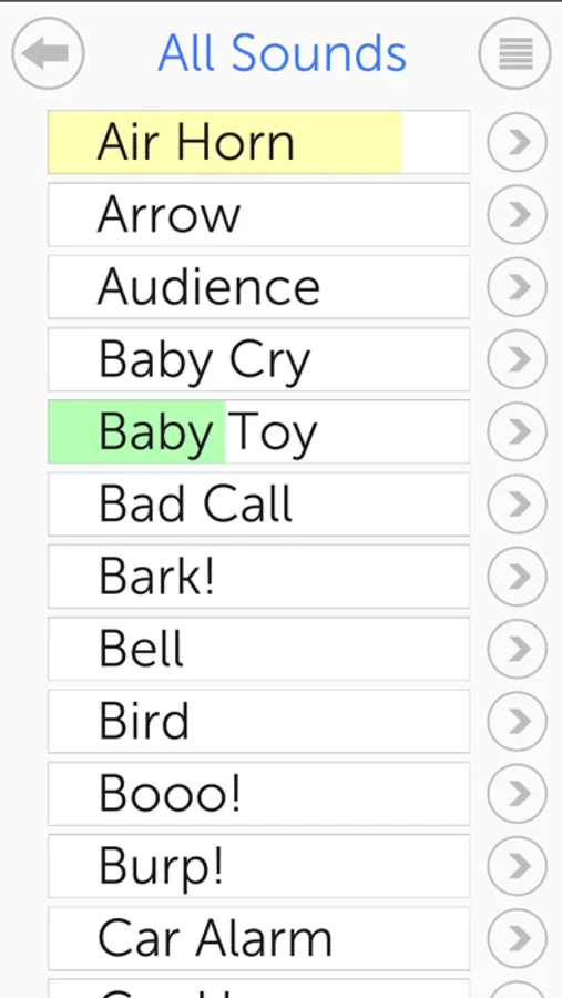 Scroll the list to get access to all your sounds. Tap the right arrow button next to the sound to toggle favorites and enable sound timers. Toggle the view between All Sounds and Favorites by tapping the view button located at the top right of screen.