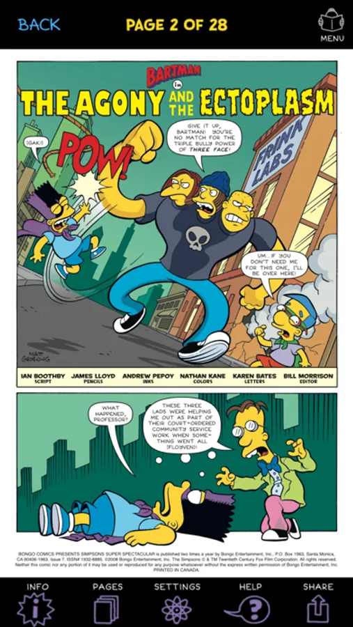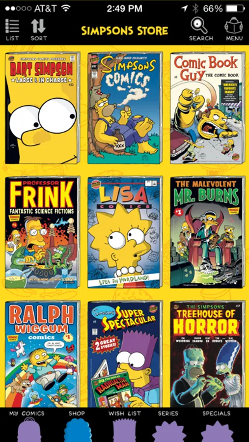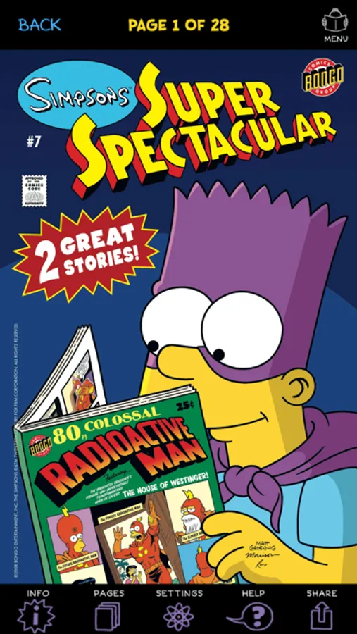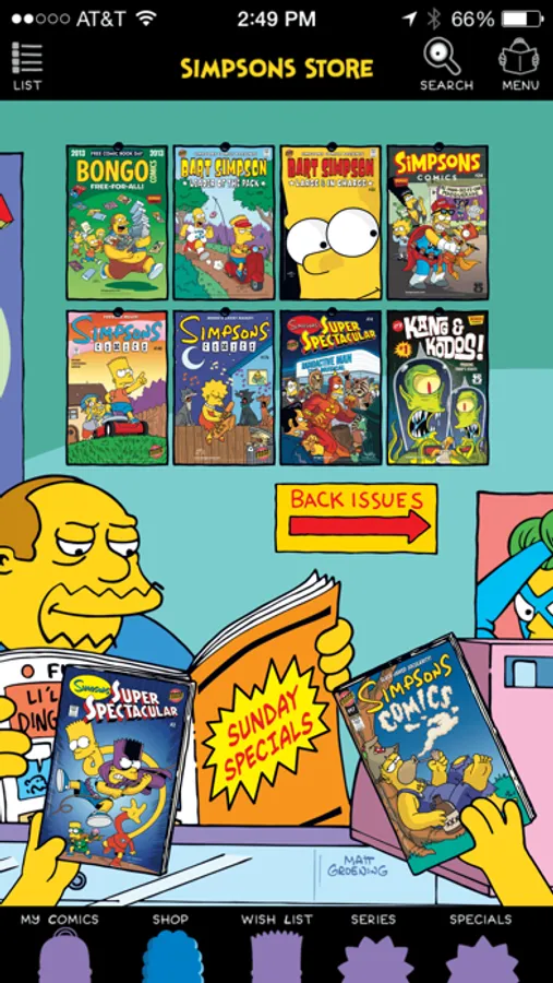 From A (for “¬Aye, carumba!”) to Z (for “Zazz”), Matt Groening, the master of mirthful mischief, presents over twenty years of titles from his very own publishing company, Bongo Comics Group! The new Simpson Store app features an ever-expanding library of digital versions of the best humor books in the biz, including family-friendly and familiar titles such as Simpsons Comics, Bart Simpson, Treehouse of Horror, and many, many more!