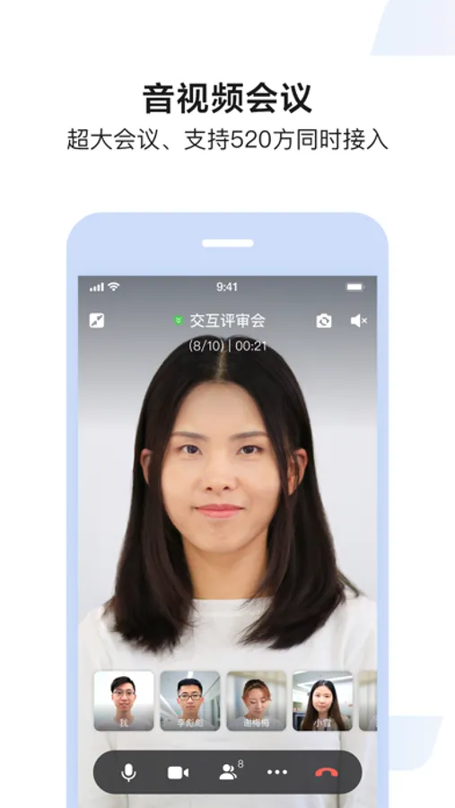 6. 免费网络电话,使用完全自主研发的高清语音通话技术,支持多达520人同时通话