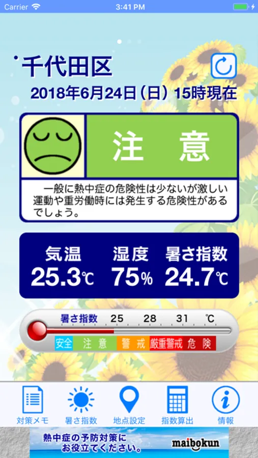 今後24時間の暑さ指数(WBGT)の予測状況をお知りになりたい場合は、姉妹アプリ「熱中症予報計」をご利用ください。