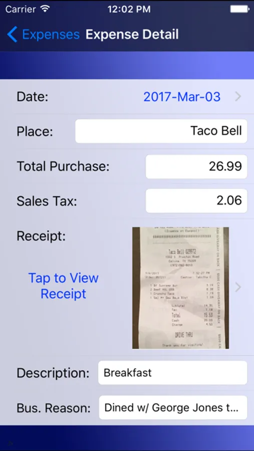 Provides a method to store receipts for sales tax purposes... Can also be used to track expenses. Tap the text on the bottom bar, and the summary will tab through each year sales tax exists.