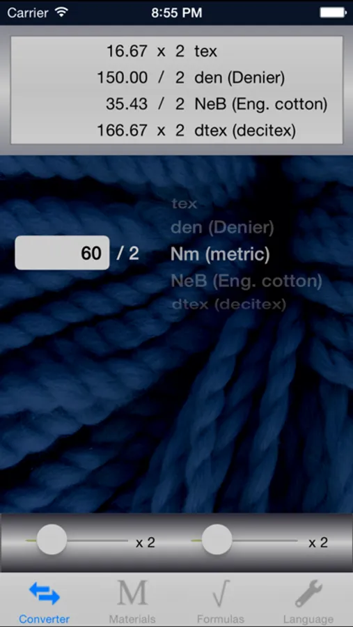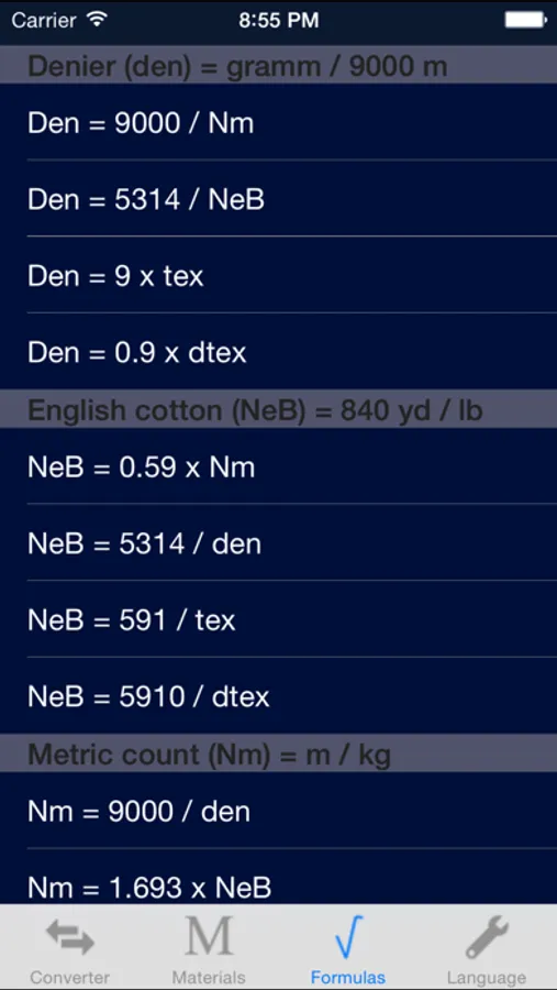 Yarn count converter (tex, dtex, den, Nm, NeB), list of conversion formulas and list of textile fibres with abbreviation. A valuable tool for textile experts. Multilingual: English, German, French, Turkish.