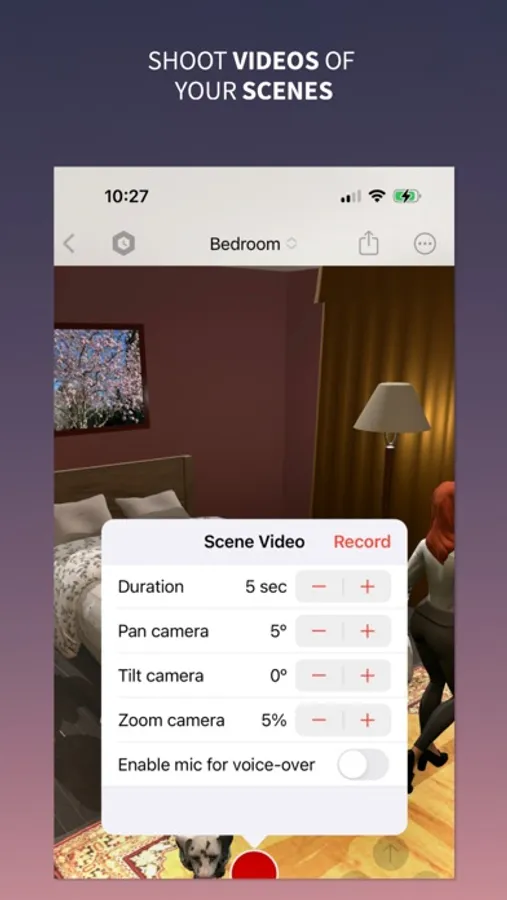 • Tap the Record button to shoot, share and save a video of the scene. Combine your scene videos into movies for fun or for work.