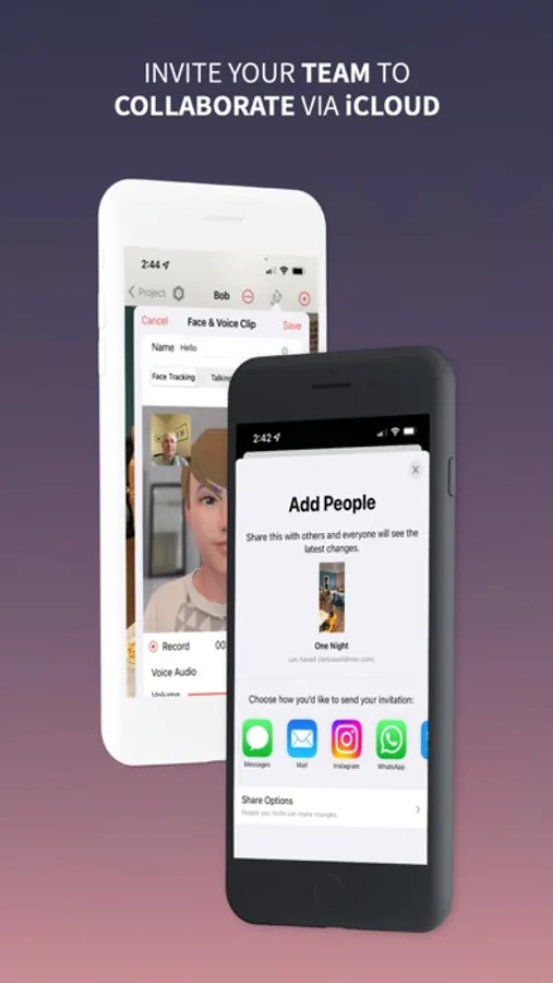 Invite your team to collaborate with you on your movies and videos via iCloud. Everyone can design and customize scenes by animating 3D models, creating and adding their own avatars, recording dialog and shooting video scenes.