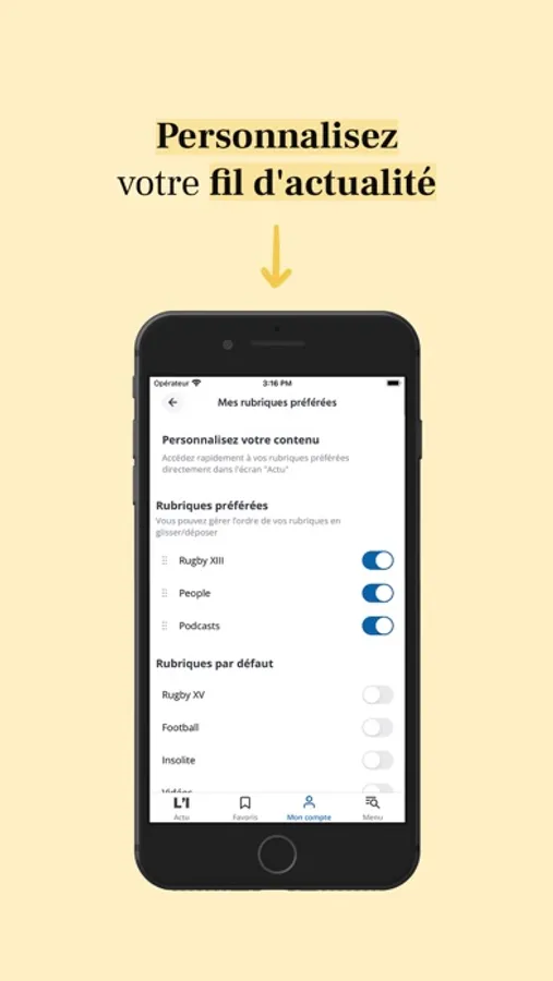 - Composez votre écran d’accueil avec les rubriques de votre choix : Economie, Sport, Santé, France-Monde …