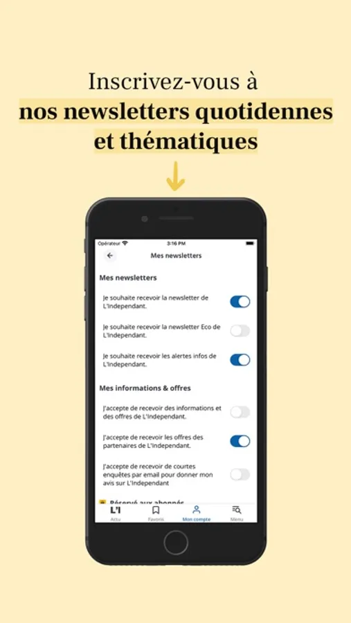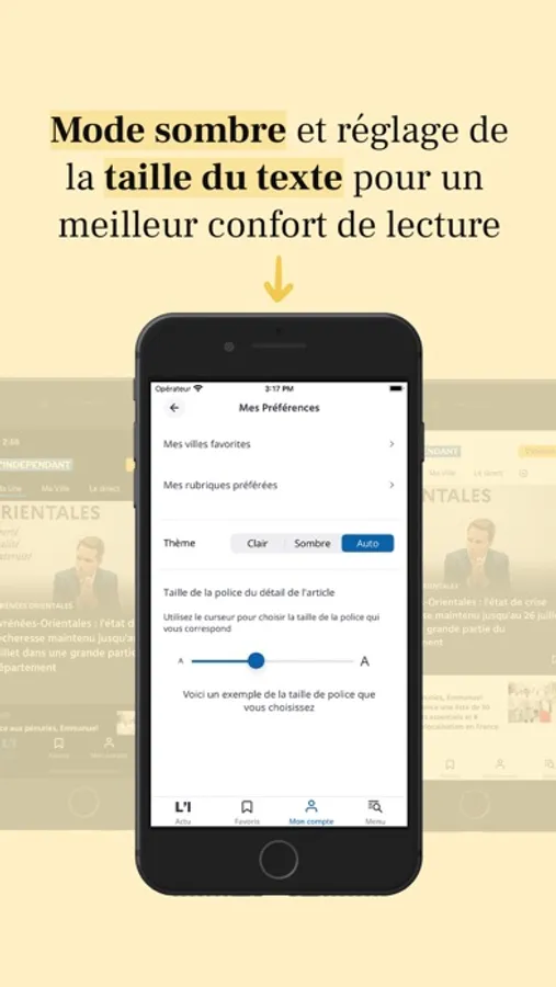 - Mon Compte : pour gérer vos paramètres d’abonnement, de notifications, de newsletters et vos préférences (villes, rubriques, thème de l’application sombre ou clair et la taille de la police)