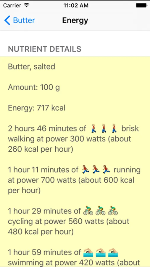 It also indicates the times needed to use up the energy contained in each food, for various physical activities.