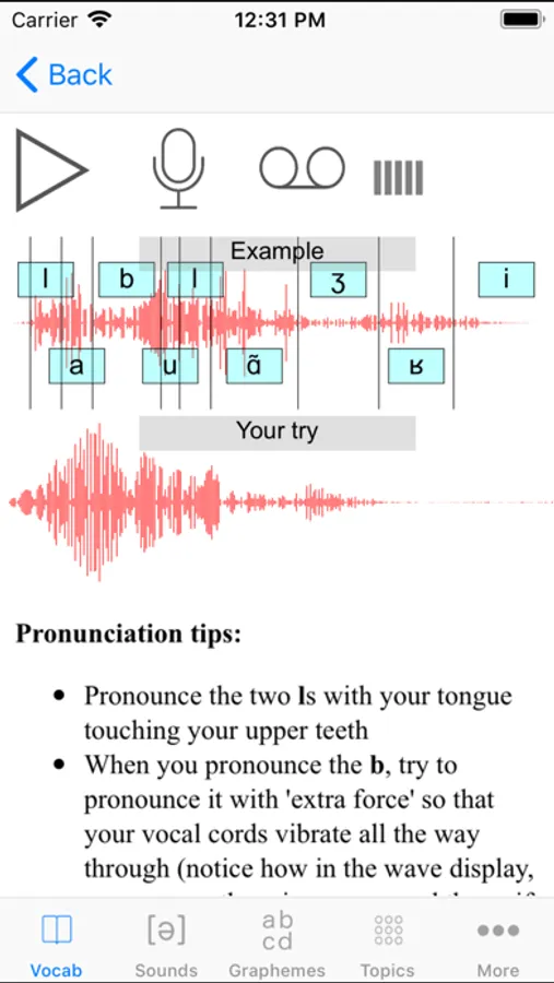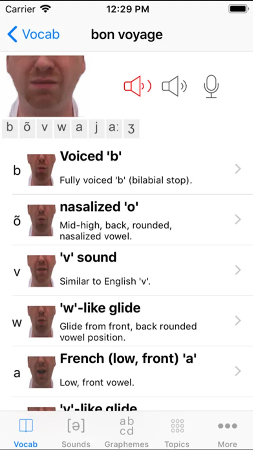 Browse the full list or search for particular French words, then simply click an item to hear it pronounced by a native French speaker, complete with a lip-synced animation and detailed phonetic descriptions. From the pronunciation screen, tap the MICROPHONE icon to access the recording screen, allowing you to compare your attempts with the native French speaker's pronunciation.