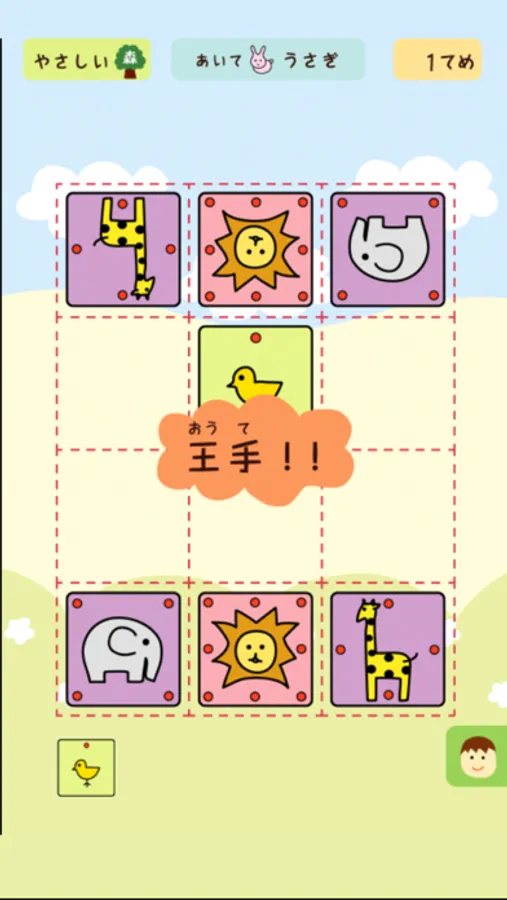 使用する駒は、「ライオン」「ぞう」「きりん」「ひよこ(ニワトリ)」の4種類のみ。どうぶつたちと一緒にライオンをつかまえます。