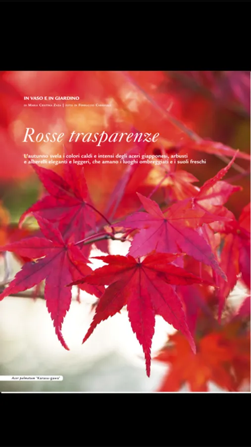 GARDENIA Since 1984 the most popular and authoritative Italian magazine on the world of gardening. Exclusive features present the most beatiful gardens in Italy and abroad to get inspiration from, with addresses of nurseries and specialized retailers to put inspiration into practice. Each month plants, shrubs and flowers are presented in depth, with drawings, detailed info and tips from experienced gardeners on how best to grow them. Gardenia offers a guide to designing green areas, be they a large garden or a small balcony, with updated displays of the best garden and outdoor furniture, both contemporary and in style. A day-by-day calendar gives advice on what to do each month in the garden, on the balcony, in the vegetable patch and in the orchard. Now also in digital edition, with all the contents of the printed issue and an interactive summary.