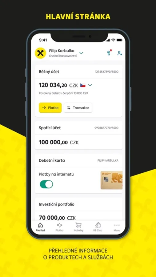 Při aktivaci si nastavte vlastní S-PIN, kterým se budete přihlašovat a autorizovat všechny platby a operace. Jednoduše se přihlásíte a potvrdíte platby do 5000 Kč i pomocí Face ID nebo Touch ID.