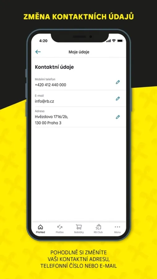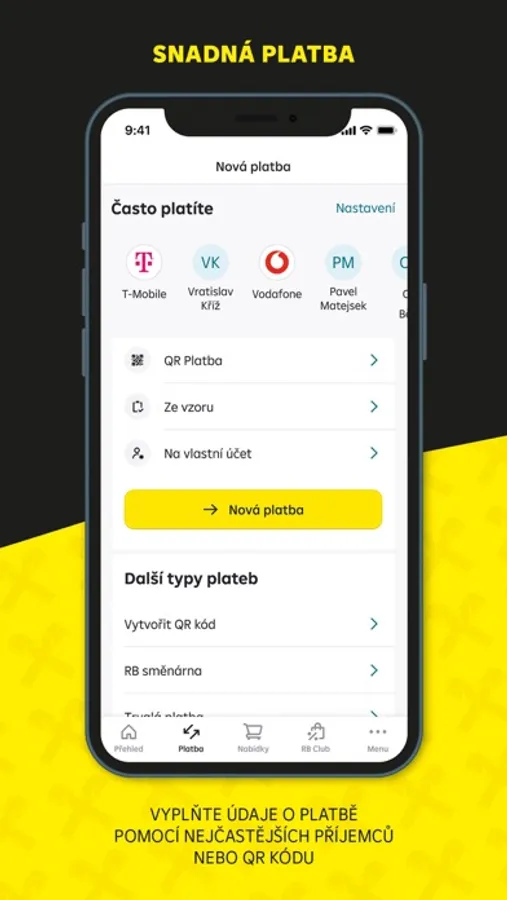 Nevyplňujte složité formuláře. Příjemce vyberte ze seznamu těch nejčastějších. Nebo použijte QR kód pro jednodušší vyplnění parametrů platby. Platbu mezi vlastními účty můžete provést tak, že na hlavní stránce podržíte prst na jednom z účtů a přetáhnete jej na jiný účet.