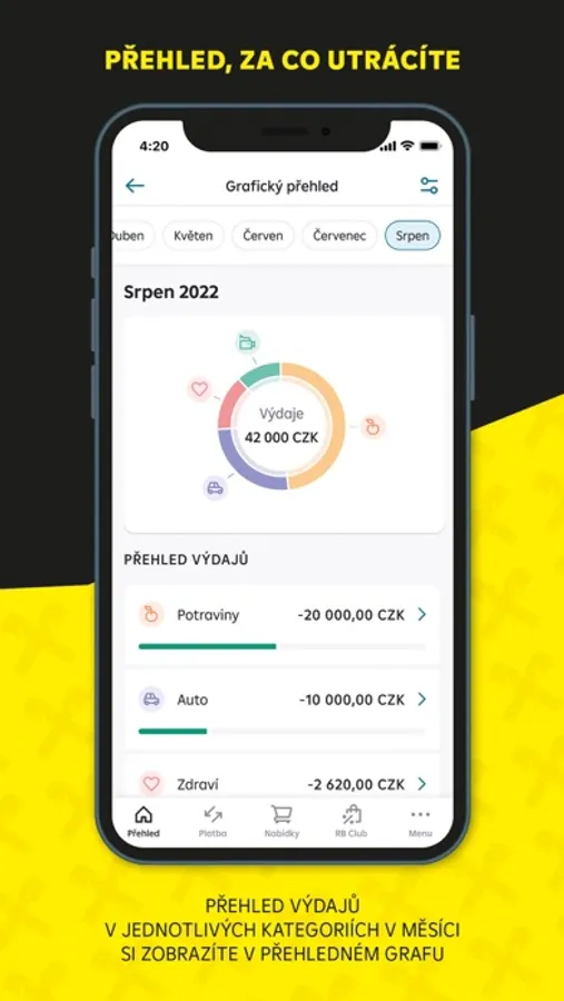 Nejen ke karetním transakcím automaticky přiřazujeme jejich kategorie. Kompletní přehled výdajů v jednotlivých kategoriích za daný měsíc si pak můžete zobrazit v přehledném grafu.